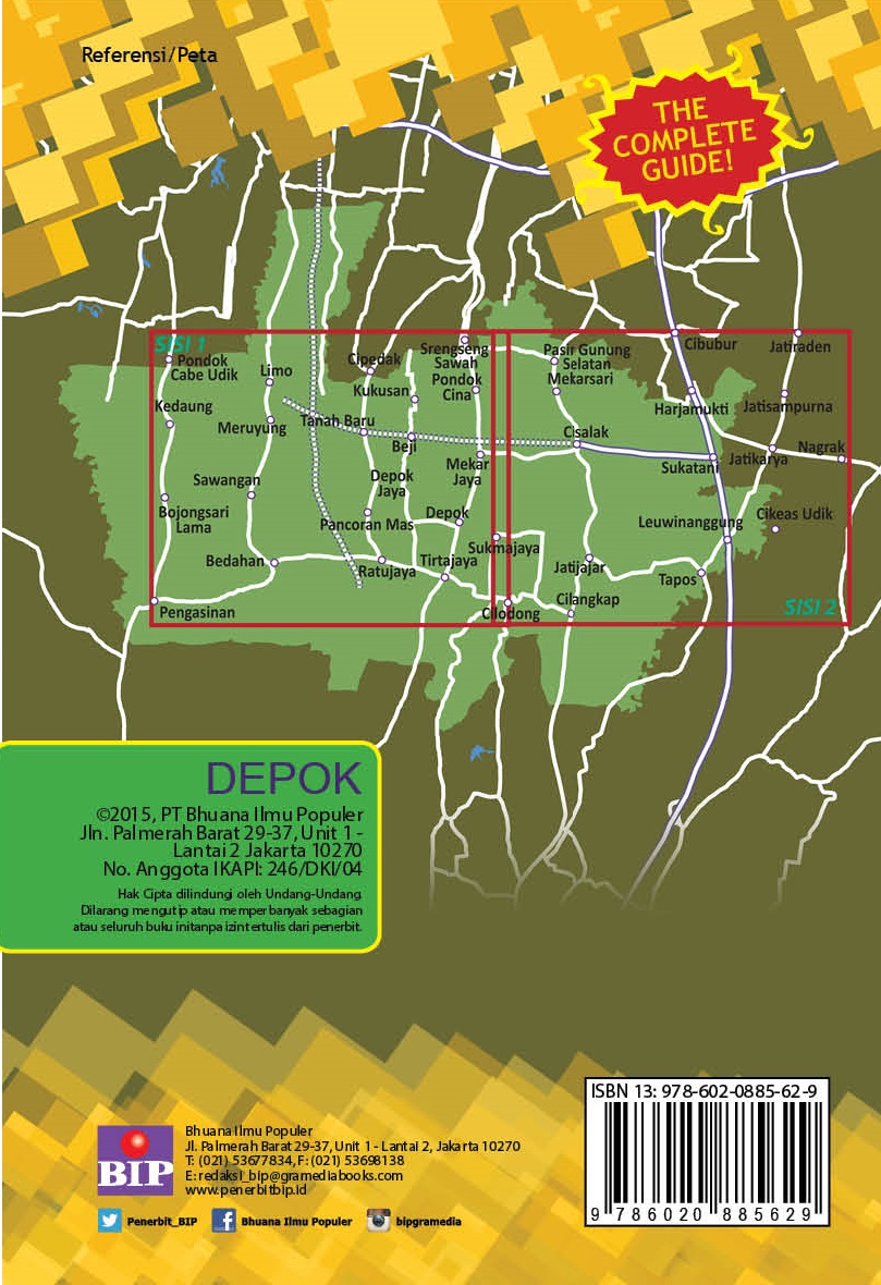 Buku ini berisi peta super lengkap, detail dan akurat jalan dan seluruh tempat penting di Kota Depok. Menyajikan peta dengan data paling baru termasuk informasi transportasi, sekolah, pusat perbelanjaan, taman dan tempat wisata. Paling mudah melakukan pencarian alamat dengan penunjuk nomor blok pada peta serta batas administrasi dan kode pos. Dibuat oleh Dr. Riadika Mastra yang telah menerbitkan peta mega best seller, Peta Megapolitan sebagai refrensi lokasi di kawasan Jabodetabek paling akurat sejak tahun 2004.