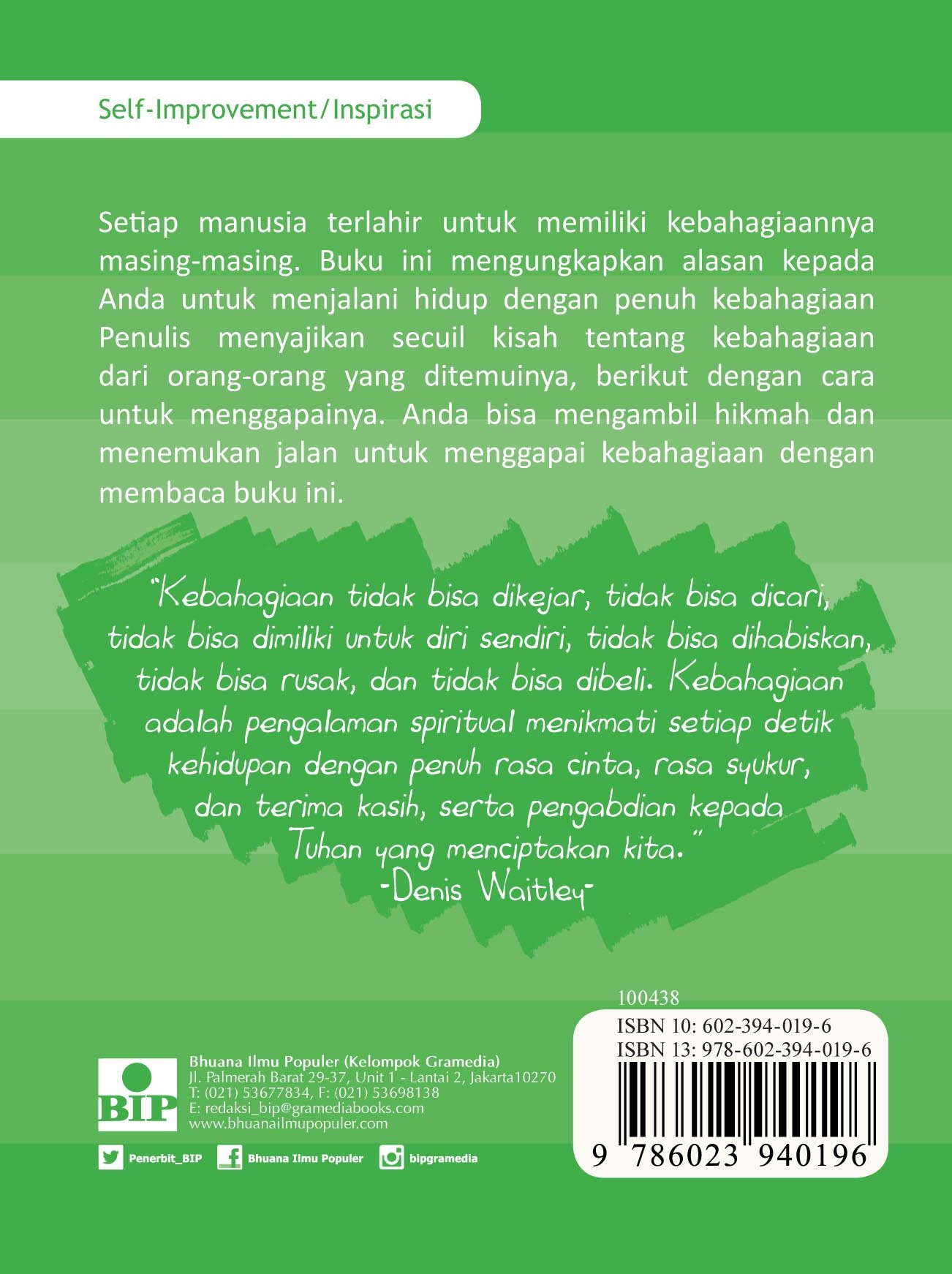 Alasan untuk Bahagia akan memberikan alasan kepada Anda untuk menjalani kehidupan dengan penuh kebahagiaan dan menyingkirkan hal-hal yang membuat dunia Anda menjadi buruk. Melalui buku ini, penulis mencoba memberikan penyelesaian dan jalan keluar paling sederhana untuk mengatasi permasalahan hidup dan menemukan secercah cahaya kebahagiaan yang akan menerangi hidup, bahkan dalam gelap gerhana sekalipun. Dalam buku ini, penulis menyajikan secuil kisah-kisah kebahagiaan yang dimiliki oleh seseorang dan bagaimana perjalanannya untuk menggapai kebahagiaan itu, sehingga Anda bisa mengambil hikmah untuk menemukan jalan dalam pencarian kebahagiaan Anda sendiri. Penyajian isi di dalam buku ini sangat sederhana, dan akan membuat pembaca merasa nyaman dan ingin terus membacanya hingga tuntas, hingga mereka menemukan Alasan bagi Dirinya untuk menjadi Bahagia.