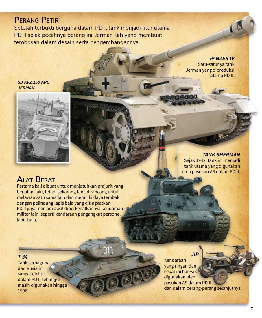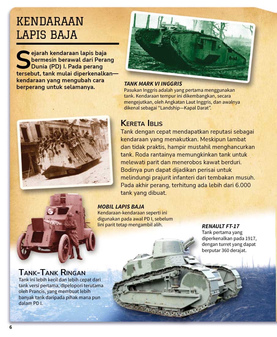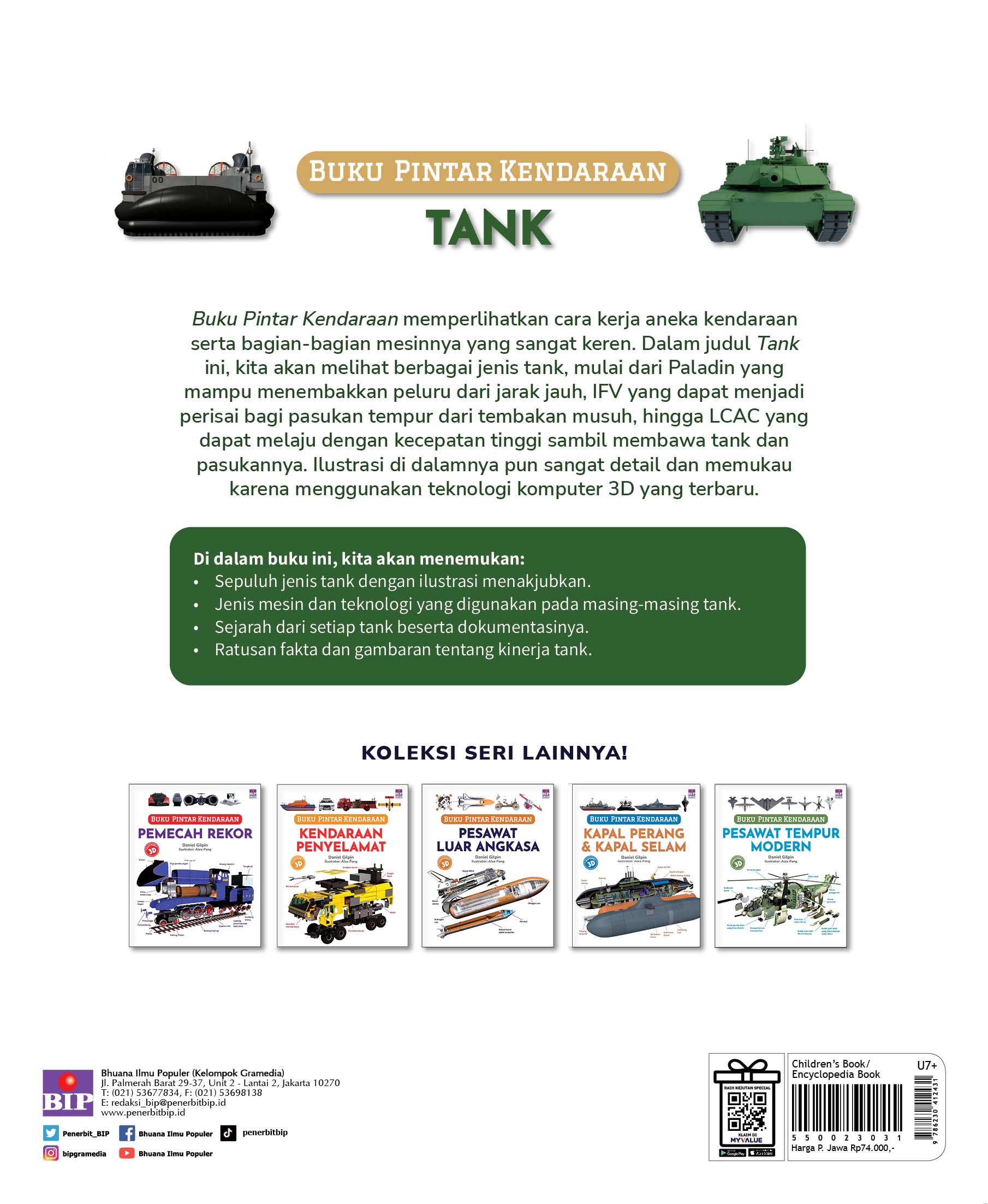 Buku Pintar Kendaraan memperlihatkan cara kerja aneka kendaraan serta bagian-bagian mesinnya yang sangat keren. Dalam judul Tank ini, kita akan melihat berbagai jenis tank, mulai dari Paladin yang mampu menembakkan peluru dari jarak jauh, IFV yang dapat menjadi perisai bagi pasukan tempur dari tembakan musuh, hingga LCAC yang dapat melaju dengan kecepatan tinggi sambil membawa tank dan pasukannya. Ilustrasi di dalamnya pun sangat detail dan memukau karena menggunakan teknologi komputer 3D terbaru.