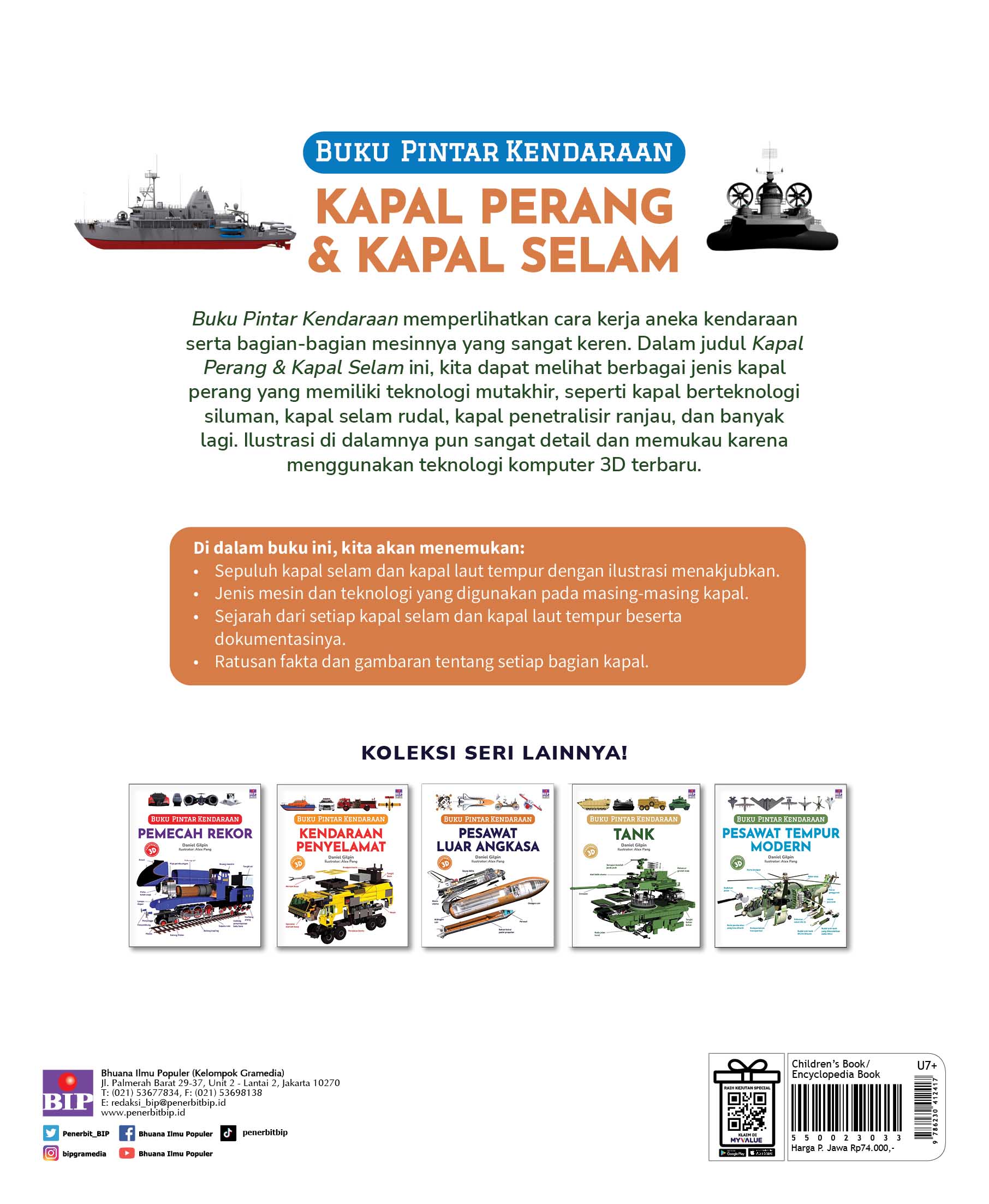 Buku Pintar Kendaraan memperlihatkan cara kerja aneka kendaraan serta bagian-bagian mesinnya yang sangat keren. Dalam judul Kapal Perang & Kapal Selam ini, kita dapat melihat berbagai jenis kapal laut perang yang memiliki teknologi mutakhir, seperti kapal berteknologi siluman, kapal selam rudal, kapal penetralisir ranjau, dan banyak lagi. Ilustrasi di dalamnya pun sangat detail dan memukau karena menggunakan teknologi komputer 3D terbaru.