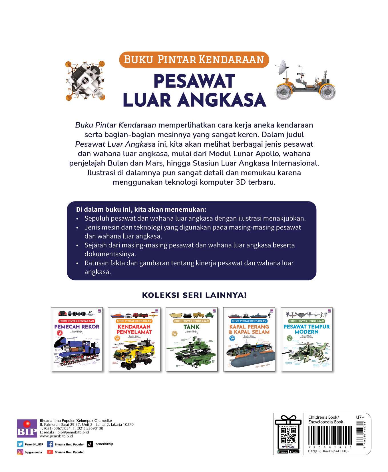 Buku Pintar Kendaraan memperlihatkan cara kerja aneka kendaraan serta bagian-bagian mesinnya yang sangat keren. Dalam judul Pesawat Luar Angkasa ini, kita akan melihat berbagai jenis pesawat dan wahana luar angkasa, mulai dari Modul Lunar Apollo, wahana penjelajah Bulan dan Mars, hingga Stasiun Luar Angkasa Internasional. Ilustrasi di dalamnya pun sangat detail dan memukau karena menggunakan teknologi komputer 3D terbaru.