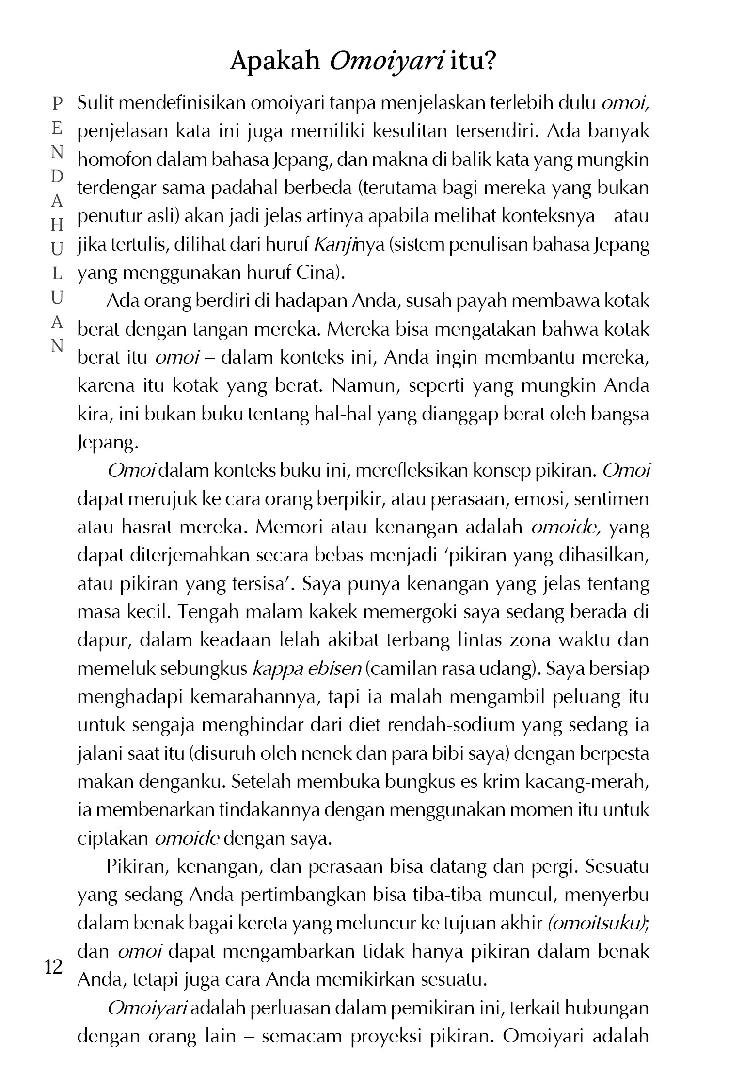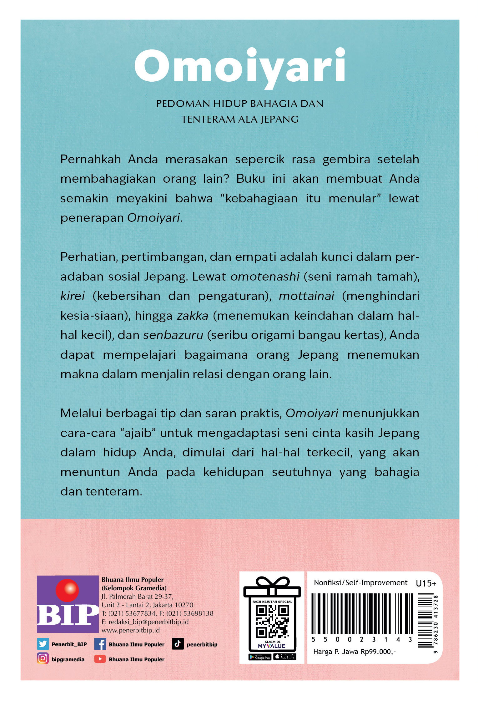 Melalui berbagai tip dan saran praktis, Omoiyari menunjukkan cara-cara “ajaib” untuk mengadaptasi seni cinta kasih Jepang dalam hidup Anda, dimulai dari hal-hal terkecil, yang akan menuntun Anda pada kehidupan seutuhnya yang bahagia dan tenteram.