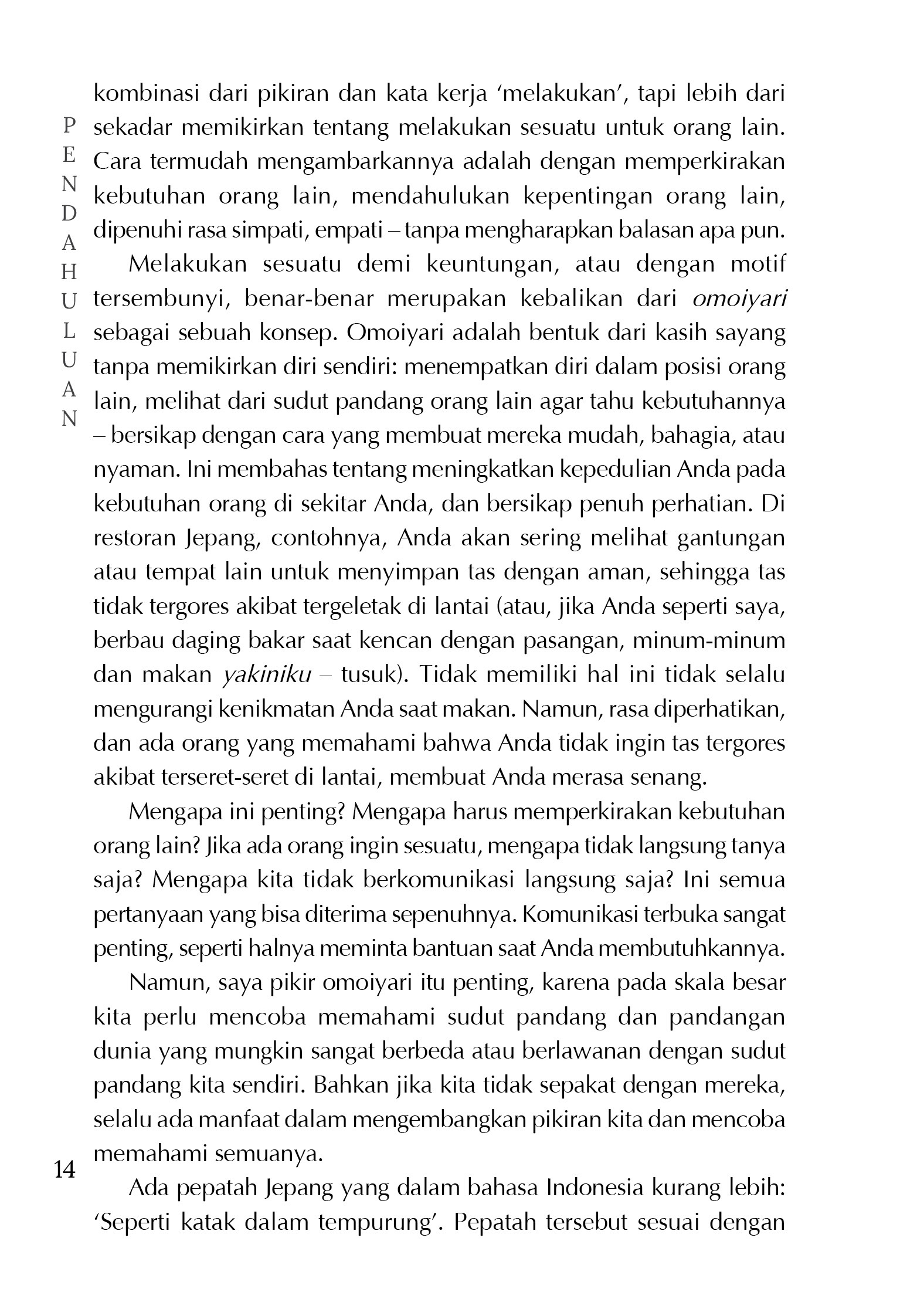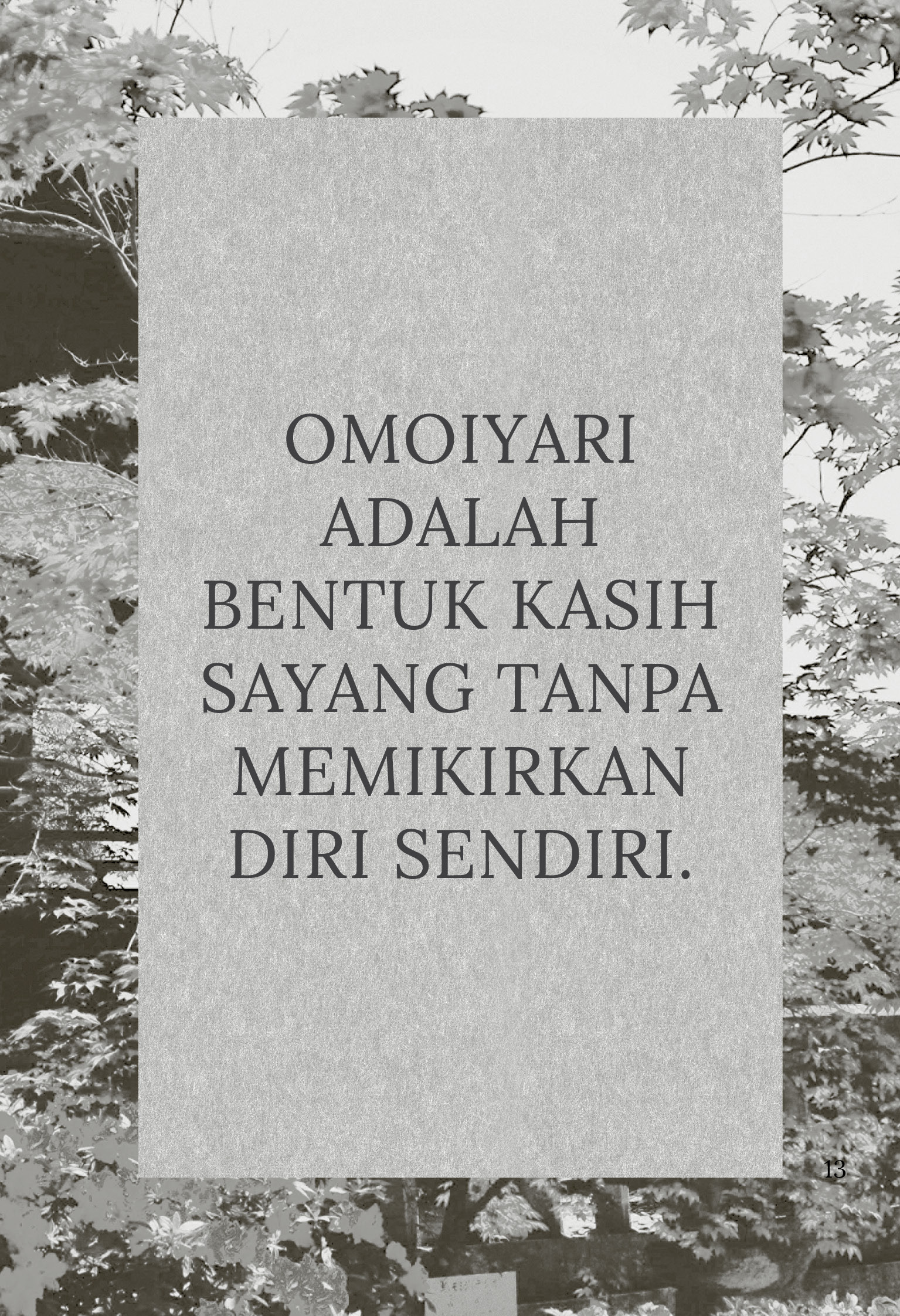 Perhatian, pertimbangan, dan empati adalah kunci dalam peradaban sosial Jepang. Lewat omotenashi (seni ramah tamah), kirei (kebersihan dan pengaturan), mottainai (menghindari kesia-siaan), hingga zakka (menemukan keindahan dalam hal-hal kecil), dan senbazuru (seribu origami bangau kertas), Anda dapat mempelajari bagaimana orang Jepang menemukan makna dalam menjalin relasi dengan orang lain.