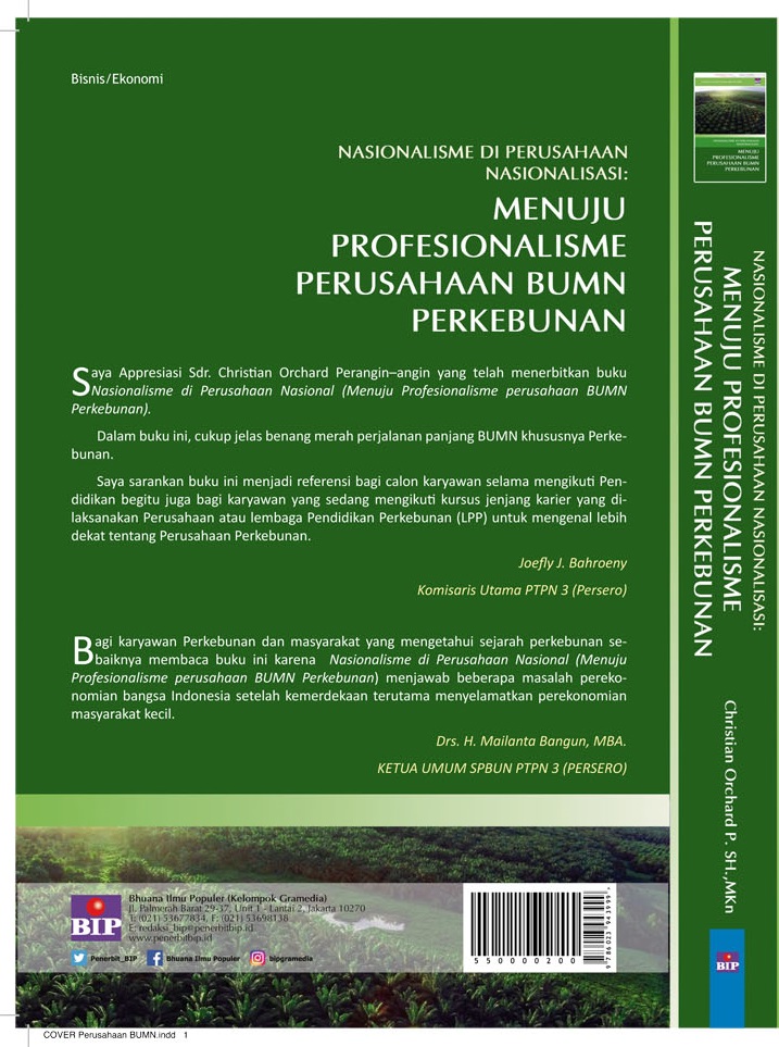 Perjalanan sejarah suatu perusahaan besar nasional  yan dikemukakan dalam buku ini akan menginspirasi mereka yang cinta akan perusahaan yang berlogo nasionalis. Mereka akan semakin percaya diri dan punya pendirian akan pengembangan perusahaan dalam mempertahankan eksistensinya sebagai pelaku usaha, yang bukan hanya bersaing dalam lingkaran nasional melainkan juga dalam lingkaran global. Nasionalisme di Perusahaan Nasional Menuju Profesionalisme perusahaan BUMN Perkebunan) menceritakan sejarah BUMN Perkebunan dari Nasionalisasisampai dengan saat ini, sekaligus meyakinkan bahwa BUMN adalah soko Guru Perekonomian Indonesia.