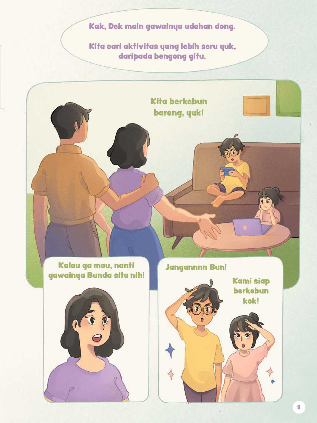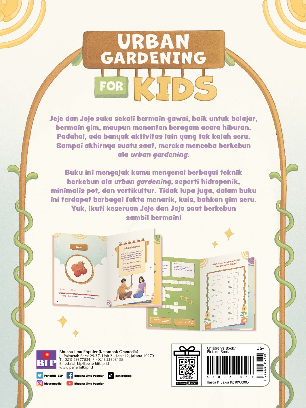 Jeje dan Jojo suka sekali bermain gawai, baik untuk belajar, bermain gim, maupun menonton beragam acara hiburan. Padahal, ada banyak aktivitas lain yang tak kalah seru. Sampai akhirnya suatu saat, mereka mencoba berkebun ala Urban Gardening. Mereka menanam berbagai macam tanaman buah, tanaman hias, dan juga sayuran. Buku ini mengajak kamu mengenal berbagai teknik berkebun Urban Gardening, seperti hidroponik, minimalis pot, dan vertikultur. Kamu dapat menerapkan teknik-teknik ini di dalam maupun di halaman rumahmu, juga di daerah perkotaan yang padat penduduk. Tidak lupa juga, dalam buku ini terdapat berbagai fakta menarik, kuis, bahkan gim seru. Yuk, ikuti keseruan Jeje dan Jojo saat berkebun sambil bermain!