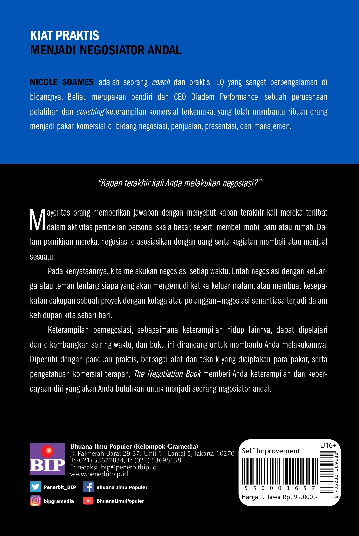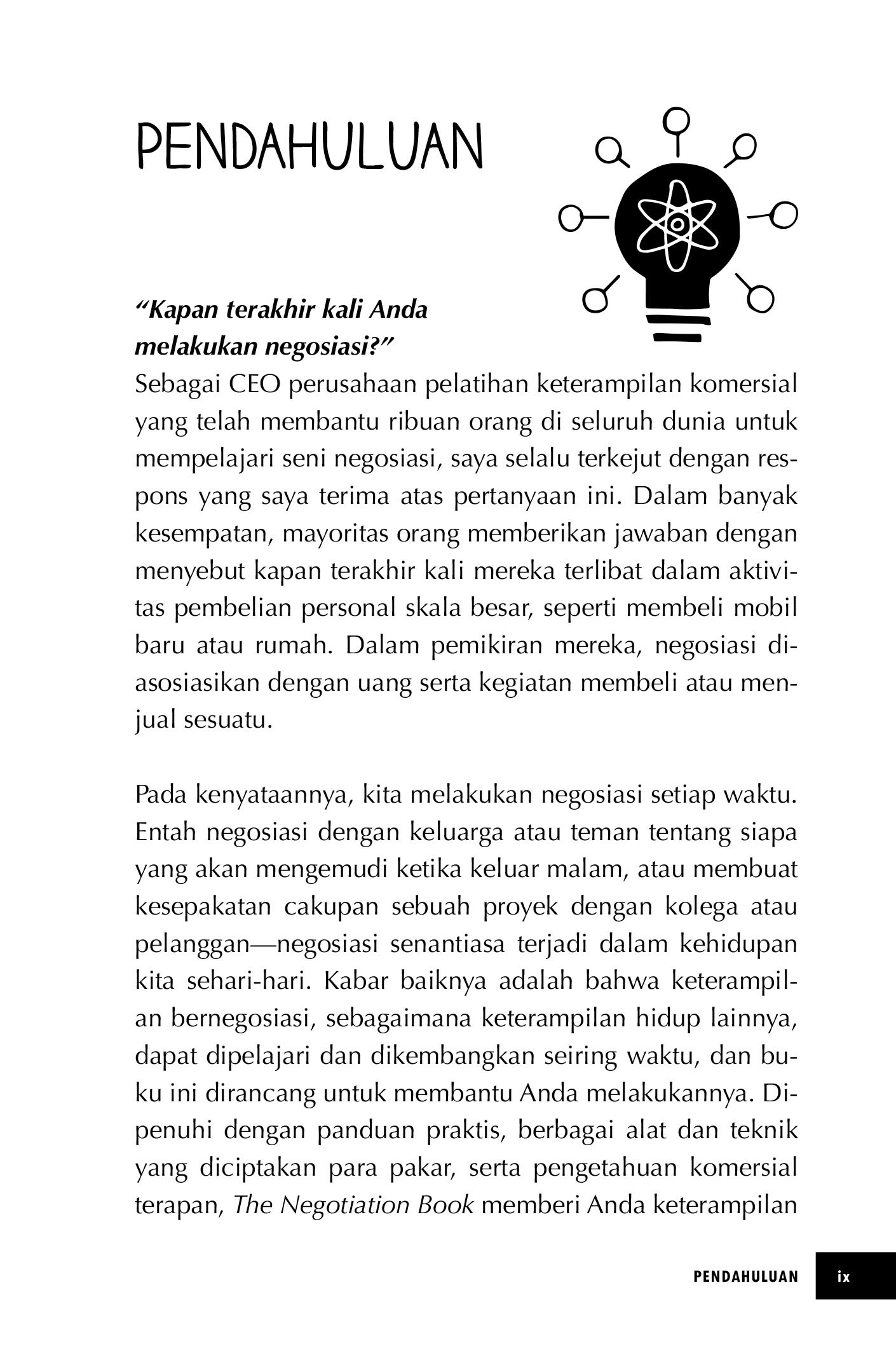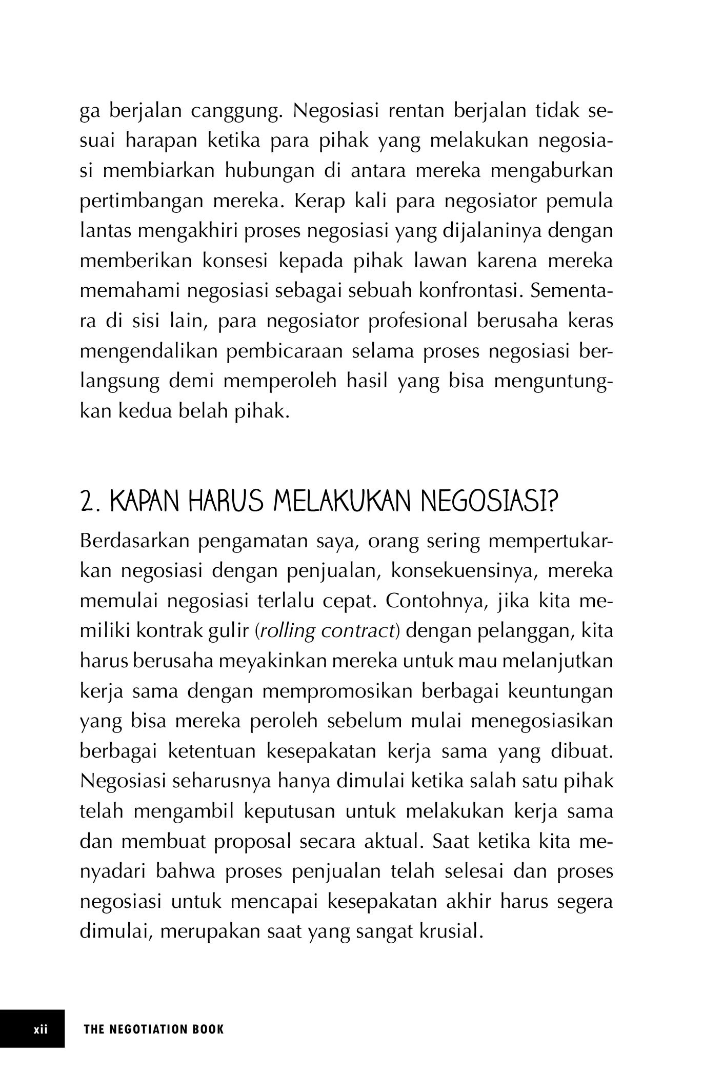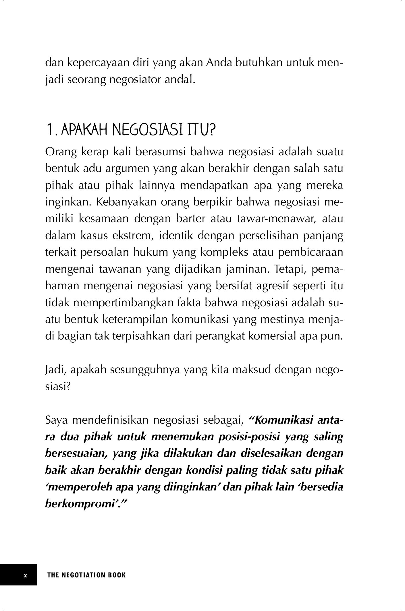Keterampilan bernegosiasi, sebagaimana keterampilan hidup lainnya, dapat dipelajari dan dikembangkan seiring waktu, dan buku ini dirancang untuk membantu Anda melakukannya. Dipenuhi dengan panduan praktis, berbagai alat dan teknik yang diciptakan para pakar, serta pengetahuan komersial terapan, The Negotiation Book memberi Anda keterampilan dan keper-cayaan diri yang akan Anda butuhkan untuk menjadi se orang negosiator andal.