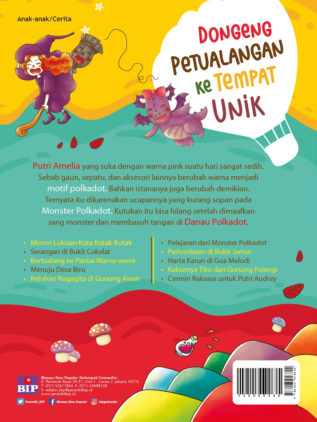 Putri Amelia yang suka dengan warna pink suatu hari merasa sangat sedih. Sebab gaun, sepatu, dan aksesori lain miliknya berubah warna menjadi motif polkadot. Bahkan istananya juga berubah demikian. Ternyata, itu dikarenakan ucapannya yang kurang sopan pada Monster Polkadot. Kutukan itu bisa hilang setelah dimaafkan sang monster dan membasuh tangan di Danau Polkadot. Kisah di atas adalah salah satu cerita yang ada di dalam buku ini dan masih ada 9 cerita seru serta menarik lainnya. Di dalam buku ini, anak-anak akan menemukan fakta menarik mengenai tempat-tempat unik di dunia yang mirip dengan negeri dongeng, seperti Danau Polkadot, Bukit Jamur, Gunung Pelangi, Gunung di Atas Awan, Pantai Warna-warni, Terowongan dengan Gambar Bergerak, dan lain sebagainya.