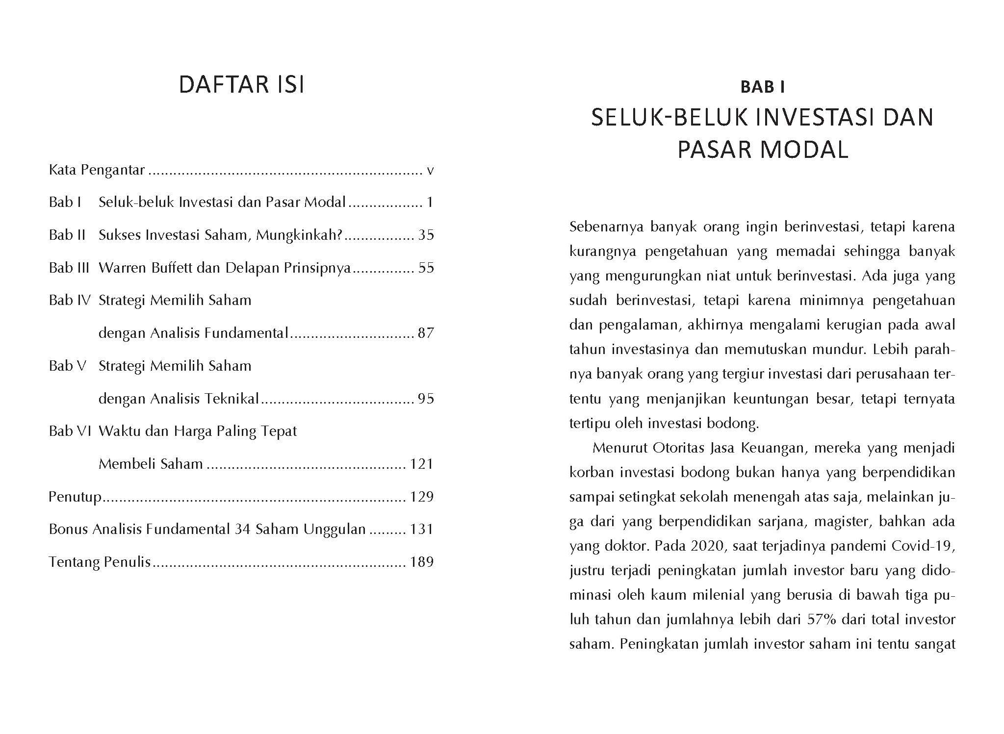 Terdapat beragam wawasan, pengalaman, dan perspektif penulis terkait investasi dan dunia pasar modal. Penulis juga memberikan analisis fundamental terhadap 34 emiten saham terbaik di Indonesia dengan cara yang praktis dan mudah dipahami, serta turut mendalami pergerakan harga saham dengan analisis teknikal, sehingga menjadi panduan awal yang penting bagi para investor pemula untuk mengindentifikasi dan menghindari kinerja saham yang kurang baik, serta mengambil keputusan terbaik tanpa ragu.