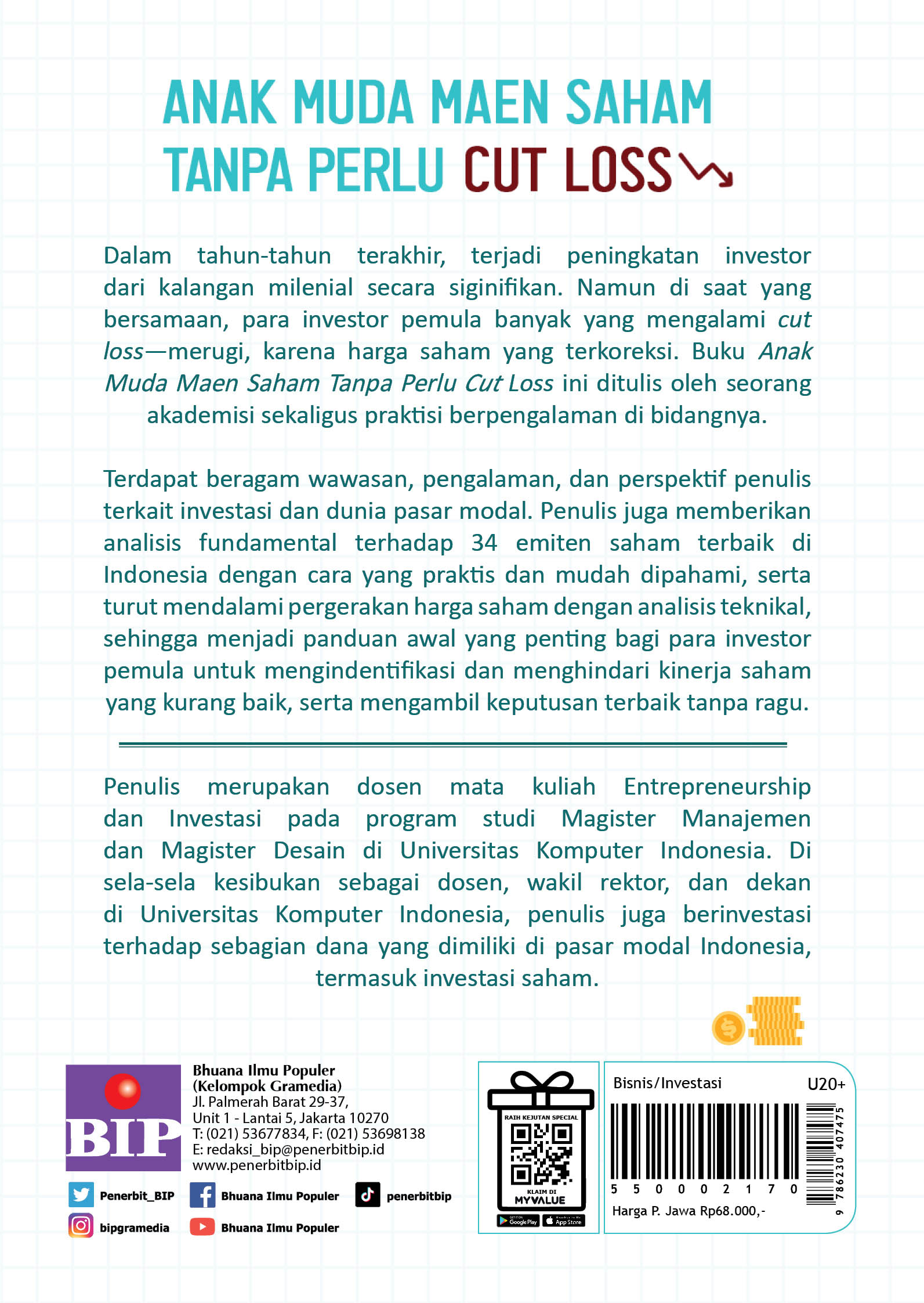 Dalam tahun-tahun terakhir, terjadi peningkatan investor dari kalangan milenial secara siginifikan. Namun di saat yang bersamaan, para investor pemula banyak yang mengalami cut loss—merugi, karena harga saham yang terkoreksi. Buku Anak Muda Maen Saham Tanpa Perlu Cut Loss ini ditulis oleh seorang akademisi sekaligus praktisi berpengalaman di bidangnya.