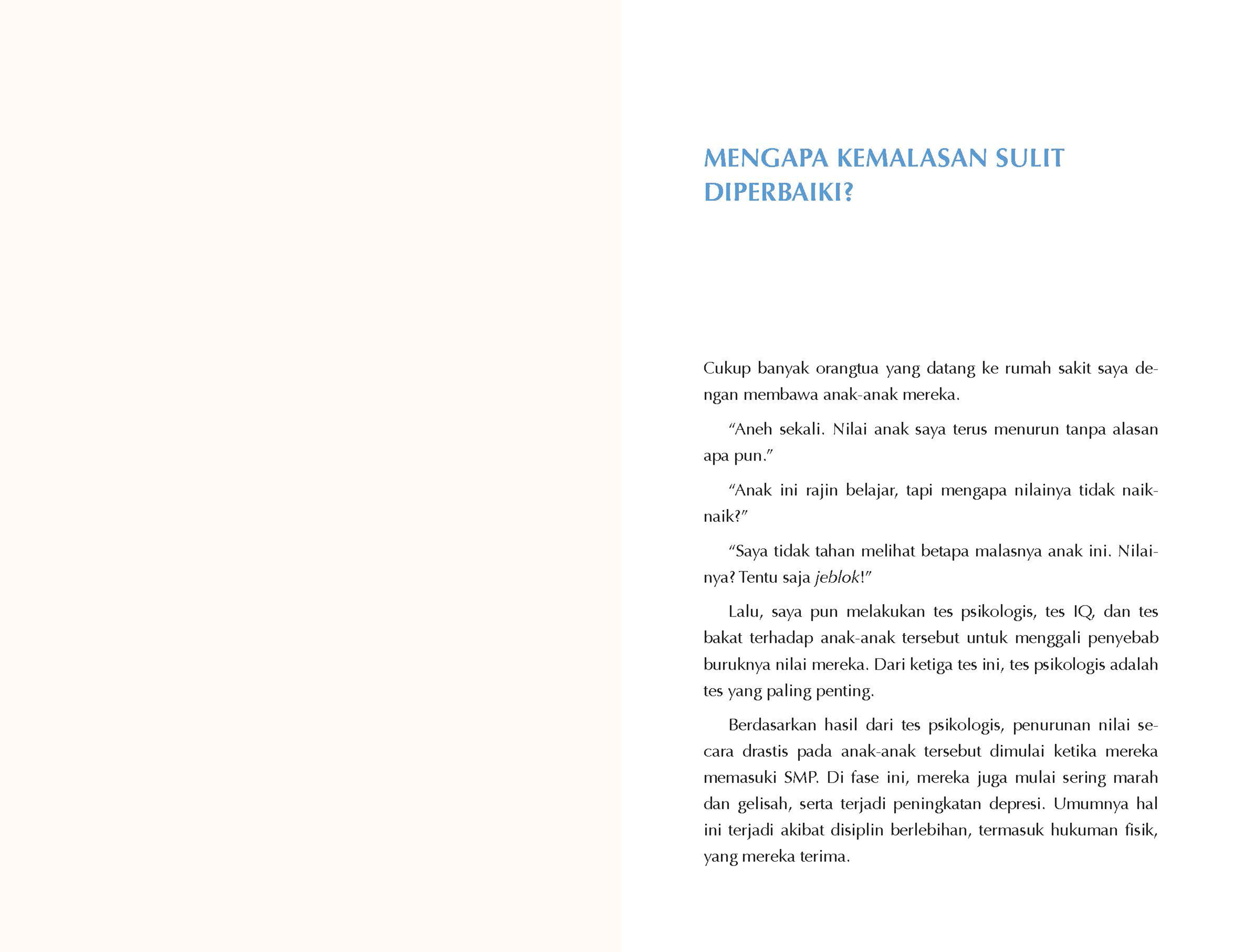 Penulis yang merupakan seorang psikiater membuat buku ini untuk membantu Anda memecahkan masalah kemalasan Anda. Dalam buku ini, Anda akan menemukan penjabaran-penjabaran menarik untuk mengenali emosi Anda dan bagaimana menghadapinya. Dengan ragam contoh yang diberikan akan membuat Anda lebih mudah membayangkan permasalahan yang Anda miliki dan memutus permasalahan tersebut dari hidup Anda. Hingga akhirnya, Anda bisa mengucapkan selamat tinggal pada kemalasan yang selama ini menghantui.
