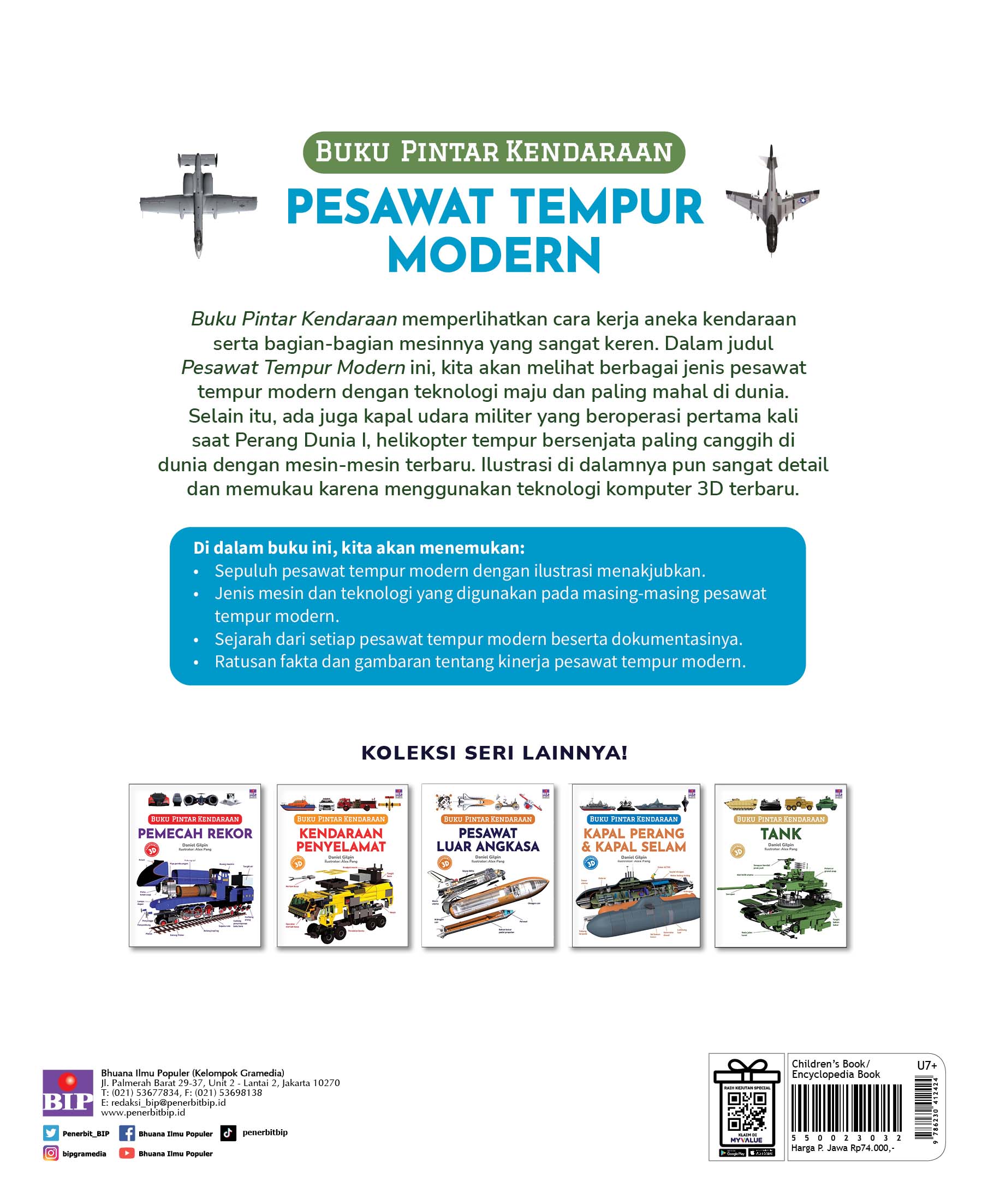 Buku Pintar Kendaraan memperlihatkan cara kerja aneka kendaraan serta bagian-bagian mesinnya yang sangat keren. Dalam judul Pesawat Tempur Modern ini, kita akan melihat berbagai jenis pesawat tempur modern dengan teknologi maju dan paling mahal di dunia. Selain itu, ada juga kapal udara militer yang beroperasi pertama kali saat Perang Dunia I, helikopter tempur bersenjata paling canggih di dunia, hingga pesawat militer dengan mesin-mesin terbaru. Ilustrasi di dalamnya pun sangat detail dan memukau karena menggunakan teknologi komputer 3D terbaru.