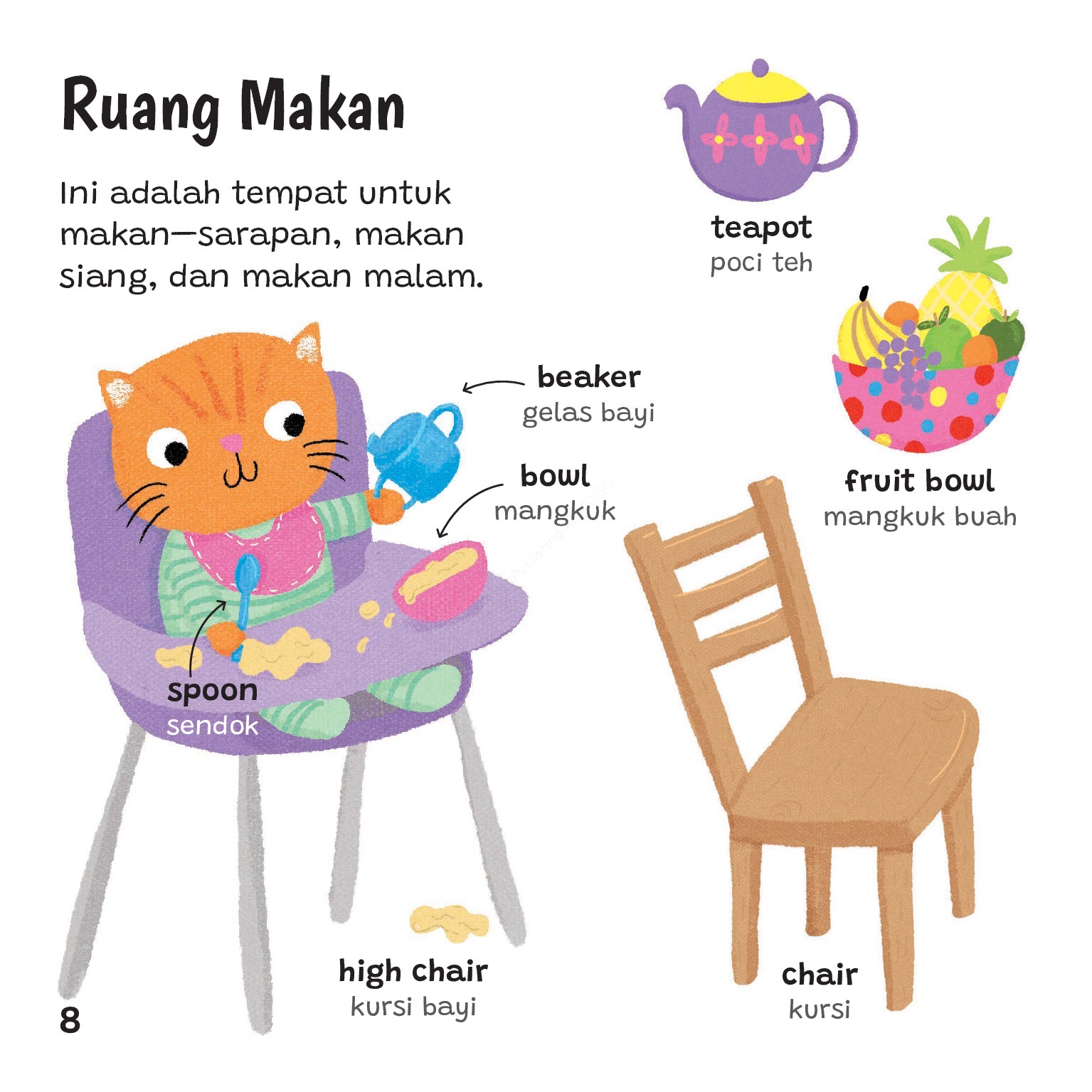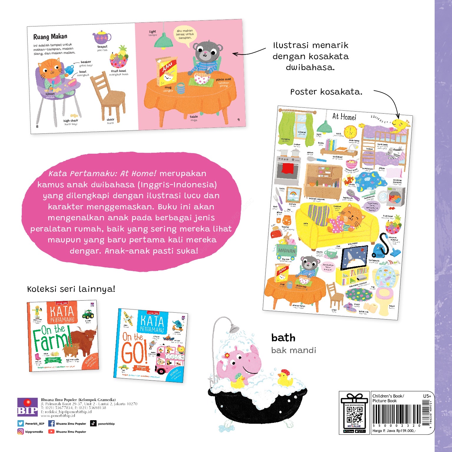 Kata Pertamaku: At Home! merupakan kamus anak dwibahasa (Inggris-Indonesia) yang dilengkapi dengan ilustrasi lucu dan karakter menggemaskan. Buku ini akan mengenalkan anak pada berbagai jenis peralatan rumah, balk yang sering mereka lihat maupun yang baru pertama kali mereka dengar. Anak-anak pasti suka!