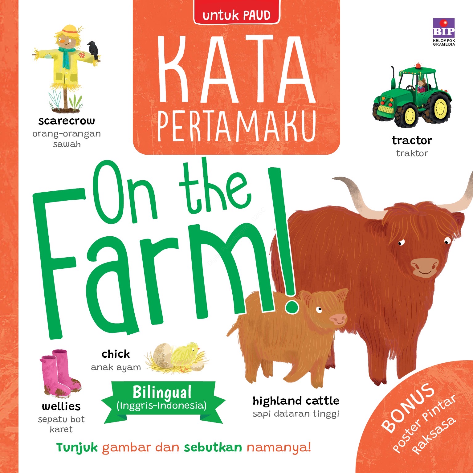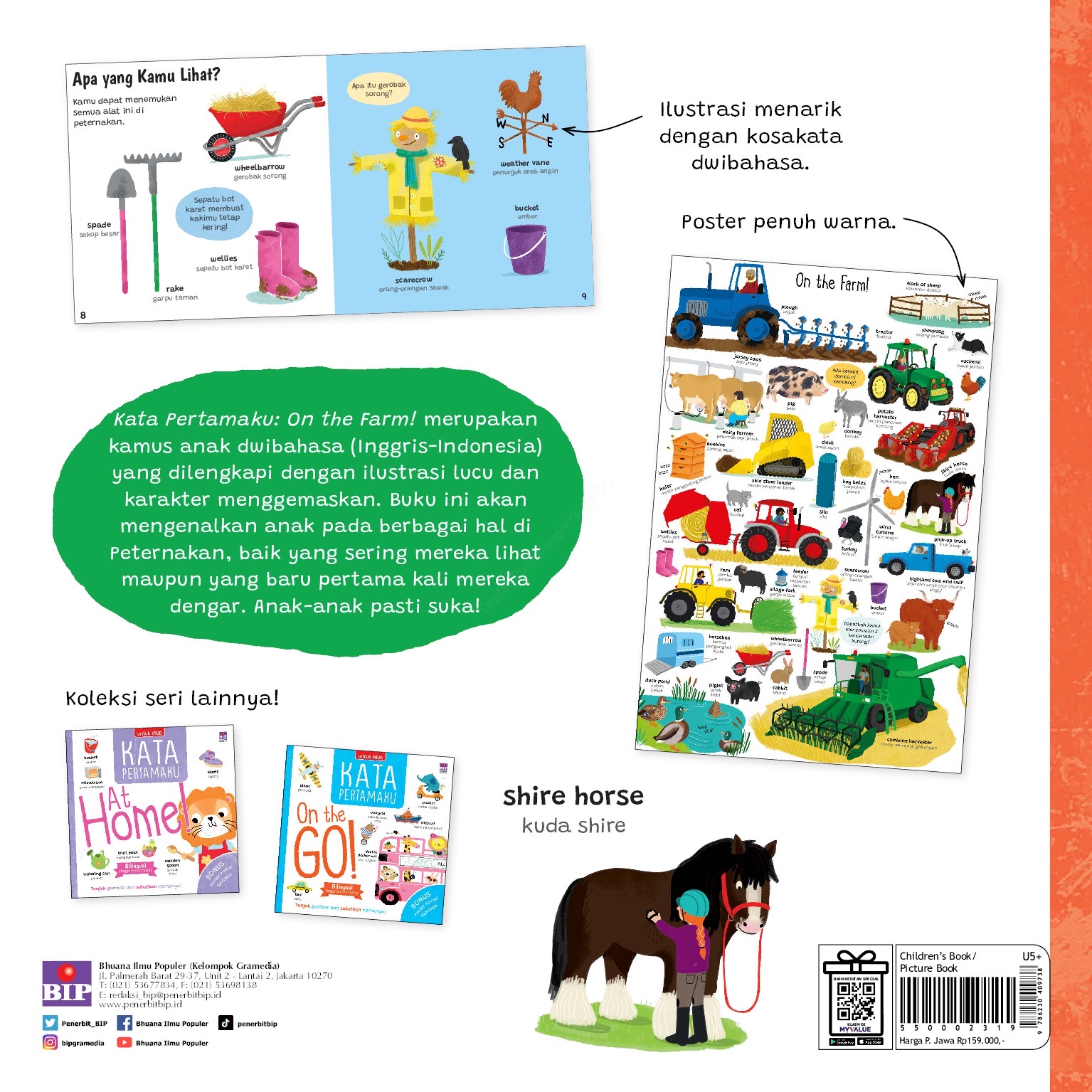 Kata Pertamaku: On the Farm! merupakan kamus anak dwibahasa (Inggris-Indonesia) yang dilengkapi dengan ilustrasi lucu dan karakter menggemaskan. Buku ini akan mengenalkan anak pada berbagai hal di Peternakan, balk yang sering mereka lihat maupun yang baru pertama kali mereka dengar. Anak-anak pasti suka!
