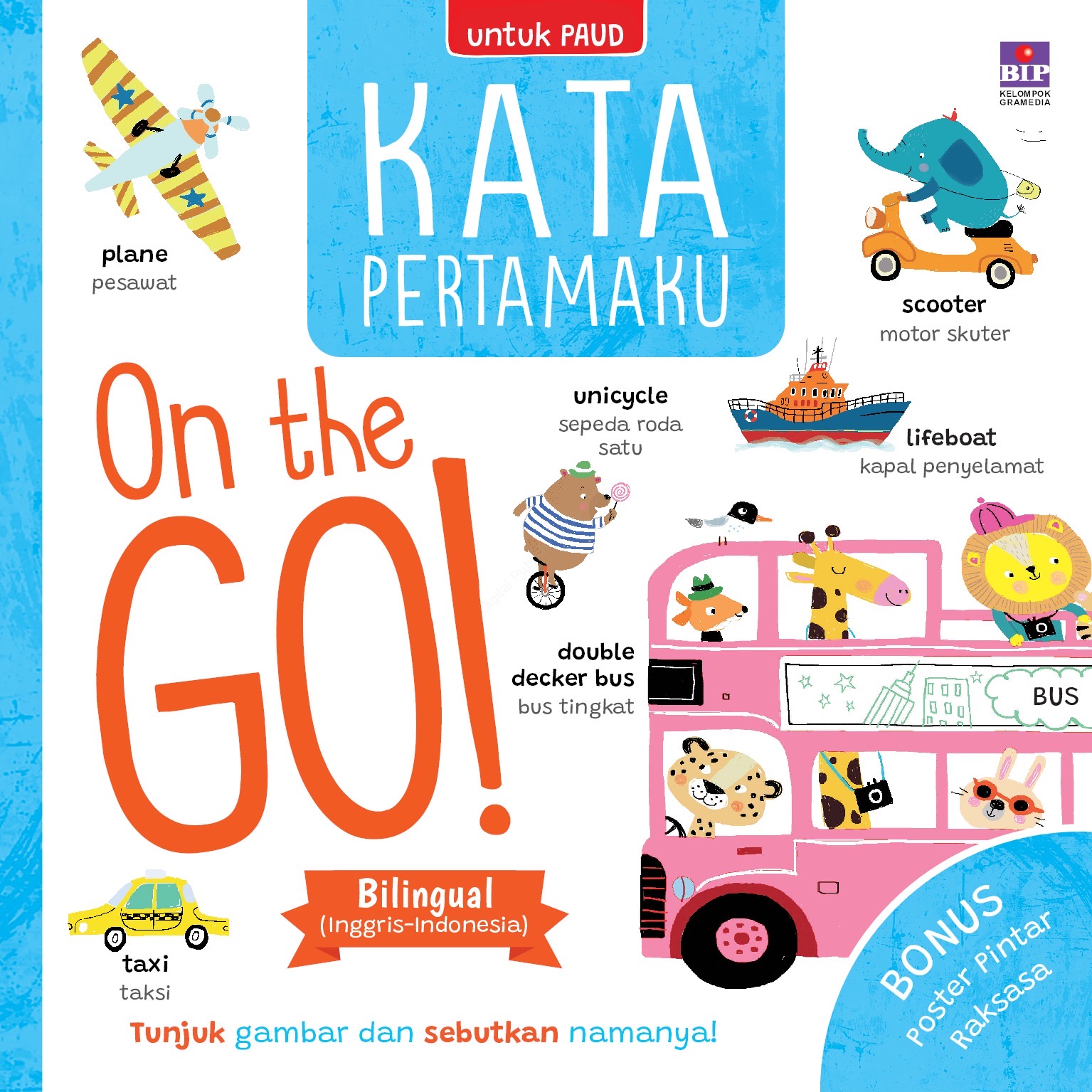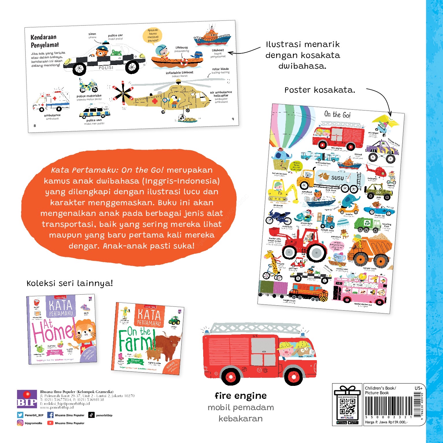 Kata Pertamaku: On the Go! merupakan kamus anak dwibahasa (Inggris - Indonesia) yang dilengkapi dengan ilustrasi lucu dan karakter menggemaskan. Buku ini akan mengenalkan anak pada berbagai jenis alat transportasi, baik yang sering mereka lihat maupun yang baru pertama kali mereka dengar. Anak-anak pasti suka!