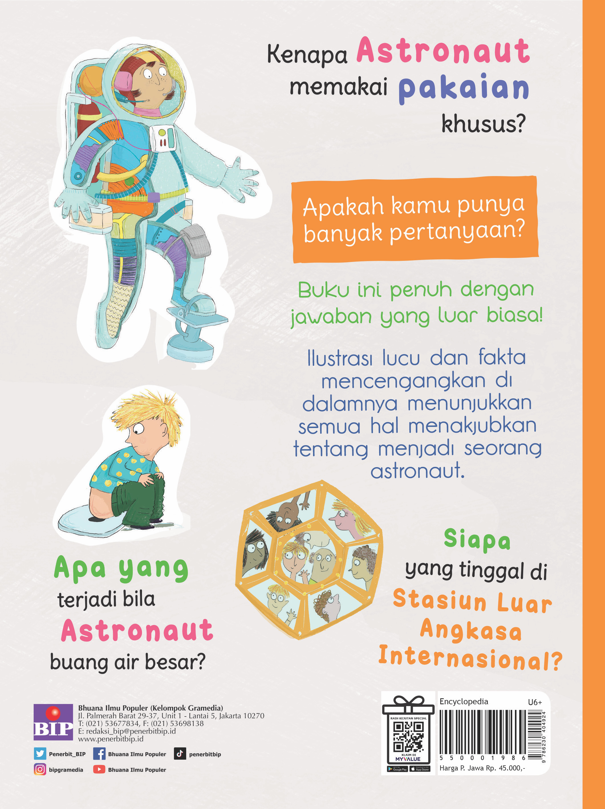 Kamu mau tahu tentang Astronaut? Bagaimana orang bisa menjadi astronaut? Apa saja yang dilakukan oleh astronaut? Bagaimana cara astronaut makan dan minum? Dan masih banyak lagi pertanyaan. Dengan konsep tanya-jawab sederhana, buku ini akan menjawab semua pertanyaan dan rasa ingin tahumu tentang astronaut.