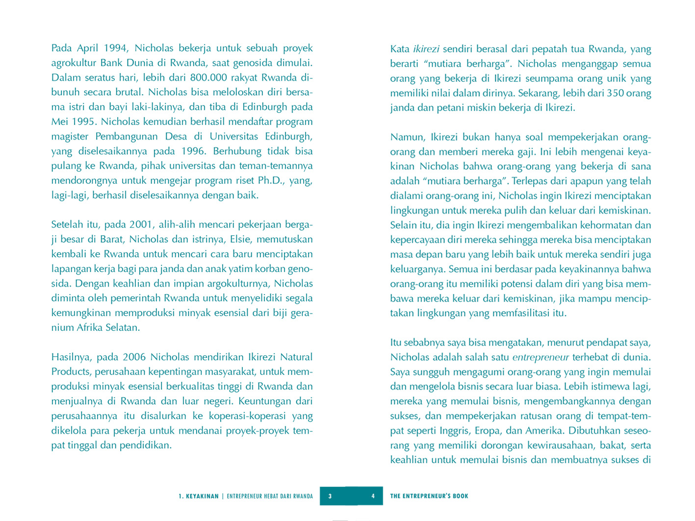 Saya akan memperkenalkan Anda pada salah seorang entrepreneur terhebat dunia yang masih hidup—seorang en trepreneur yang setara dengan Bill Gates, Richard Branson, dan Steve Jobs. Dia adalah Nicholas Hitimana, CEO Ikirezi Natural Products, sebuah agrobisnis yang berpusat di Rwan- da. Setelah mengenalnya selama bertahun-tahun, saya san- gat yakin kisahnya mengungguli semua kisah sukses dari Silicon Valley.