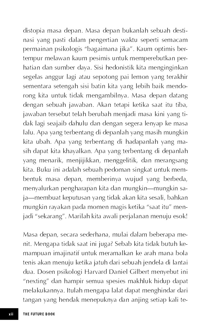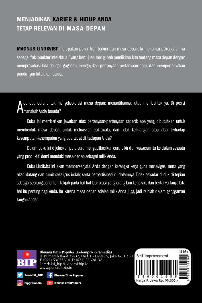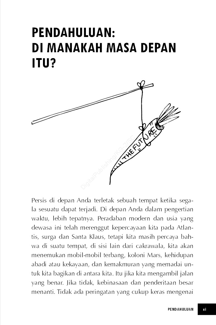 Ada dua cara untuk mengeksplorasi masa depan: menantikannya atau membentuknya. Yang pertama adalah tentang bertanya kepada orang yang tahu apa yang menurut mereka mungkin terjadi. Kemudian, membuat kaitan-kaitan yang mungkin berimplikasi pada diri Anda. Biasanya menyenangkan, sangat aman, dan dalam kenyataannya tak berarti. Yang kedua—membentuknya—tentang kesadaran yang mendalam bahwa tidak ada masa depan di luar dari masa depan yang Anda ciptakan, sebaik-baiknya memanfaatkan apa yang tersedia di sekitar Anda. Sering kali tidak mau tinggal diam, kadang-kadang berbahaya. Namun, memberi hasil yang jauh lebih besar. Pemimpin pemikiran Magnus Lindkvist dengan tegas bergabung dalam kelompok kedua ini. Para pemenang masa depan, demikian dia menyebut orang-orang di kelompok ini. Jika demikian, berapa banyak pemimpin visioner yang mengandalkan laporan-laporan tren untuk membangun masa depan yang sukses? Tidak ada.