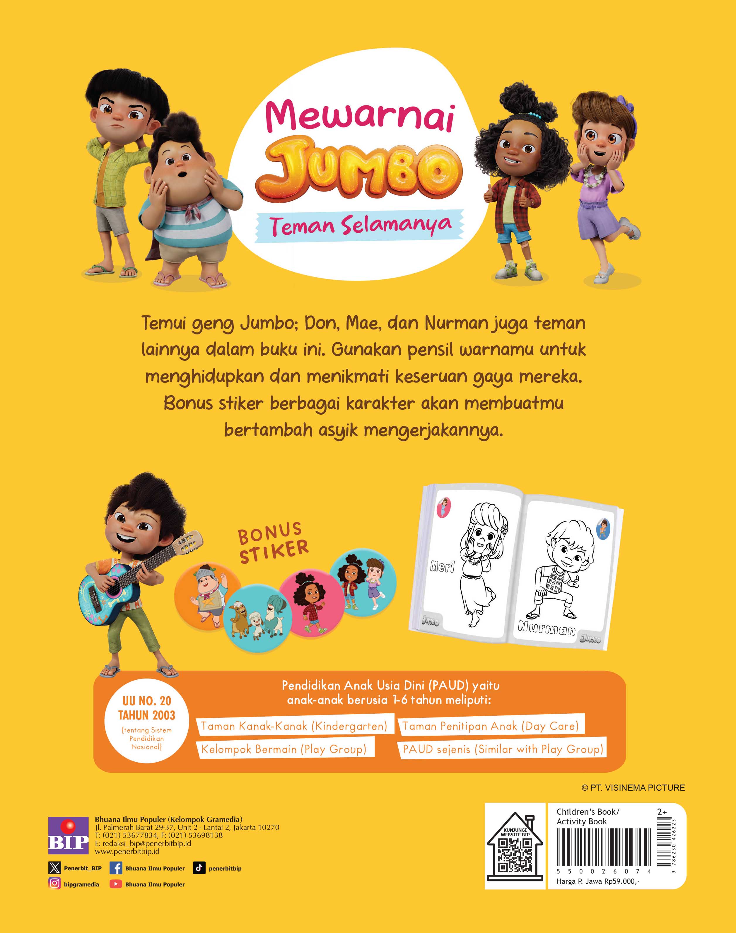 Temui geng Jumbo di dalam: Don, Mae, dan Nurman, juga teman lainnya. Gunakan pensil warnamu untuk menghidupkan dan menikmati keseruan gaya mereka. Bonus stiker berbagai karakter akan membuatmu bertambah asyik mengerjakannya.