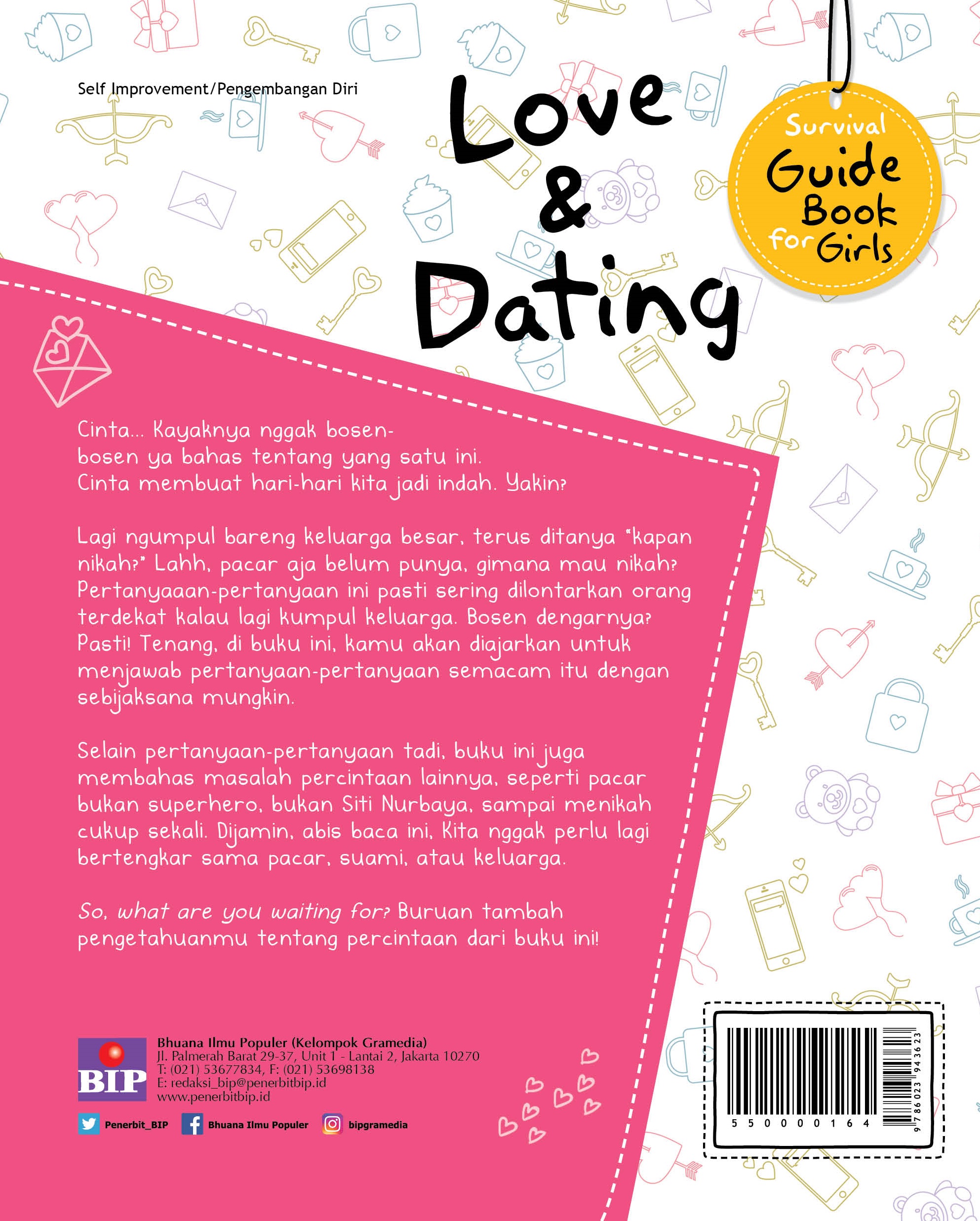 Cinta... Kayaknya nggak bosen-bosen ya bahas tentang yang satu ini. Cinta membuat hari-hari kita menjadi indah. Yakin?? Lagi ngumpul bareng keluarga besar, terus ditanya "kapan nikah?" Lahh, pacar aja belum punya, gimana mau nikah?? Pertanyaan-pertanyaan ini pasti sering dilontarkan orang terdekat kita kalau lagi kumpul keluarga. Bosen dengarnya? Pasti!! Tenang, di buku ini, kita akan diajarkan untuk menjawab pertanyaan-pertanyaan semacam itu dengan sebijaksana mungkin. Selain pertanyaan-pertanyaan tadi, buku ini juga membahas masalah percintaan lainnya, seperti pacar bukan superhero, bukan Siti Nurbaya, sampai menikah cukup sekali. Dijamin, abis baca ini, kita nggak perlu lagi bertengkar sama pacar, suami, atau keluarga. So, what are you waiting for? Buruan tambah pengetahuanmu tentang percintaan dari buku ini!!