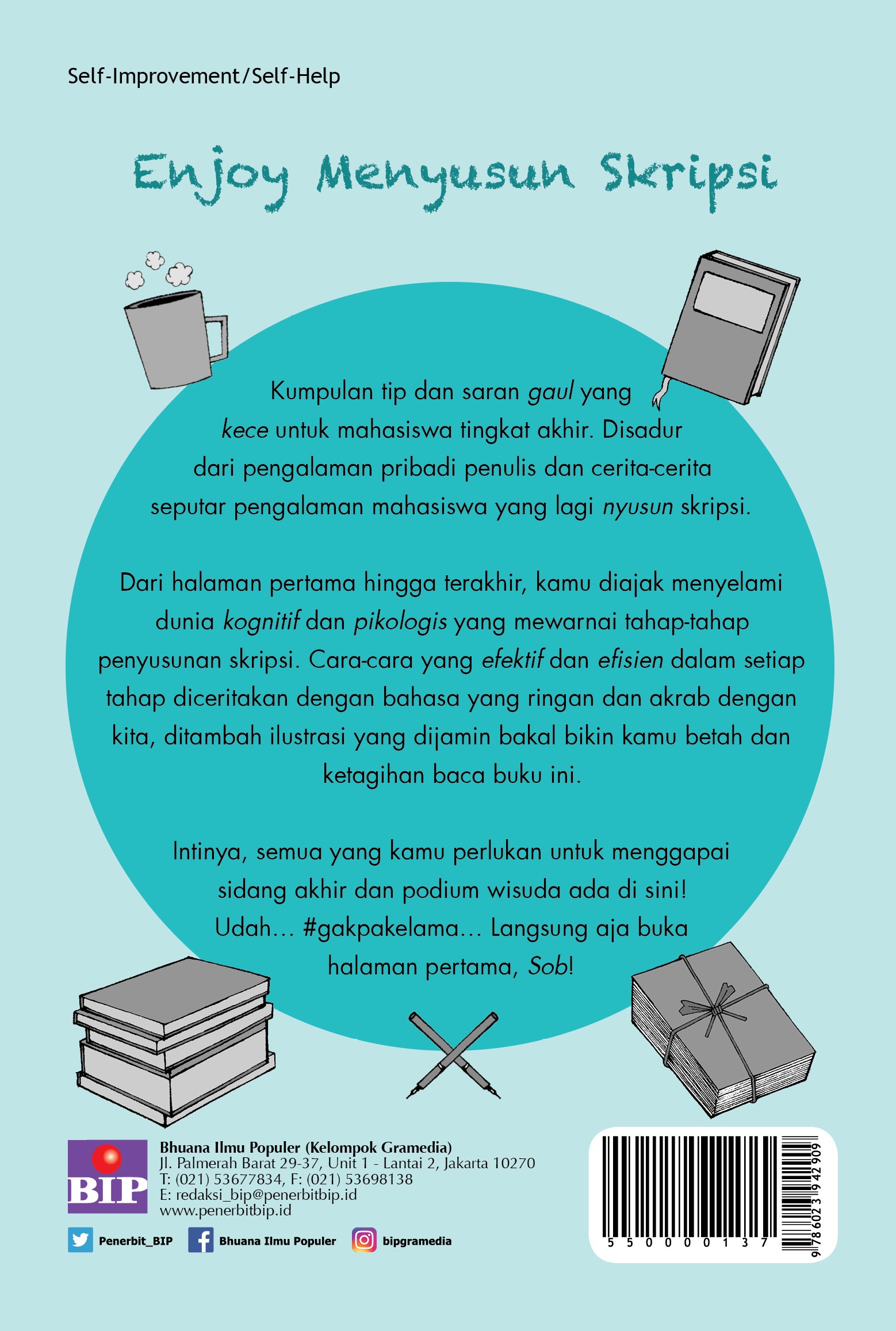 Kumpulan tip dan saran gaul yang kece untuk mahasiswa tingkat akhir. Disadur dari pengalaman pribadi penulis dan cerita-cerita seputar pengalaman mahasiswa yang lagi nyusun skripsi. Dari halaman pertama hingga terakhir, kamu diajak menyelami dunia kognitif dan psikologis yang mewarnai tahap-tahap penyusunan skripsi. Cara-cara yang efektif dan efisien dalam setiap tahap diceritakan dengan bahasa yang ringan dan akrab dengan kita, ditambah ilustrasi yang dijamin bakal bikin kamu betah dan ketagihan baca buku ini. Intinya, semua yang kamu perlukan untuk menggapai sidang akhir dan podium wisuda ada di sini! Udah... #gakpakelama... Langsung aja buka halaman pertama. Sob!