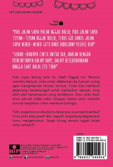 Kata siapa bilang cinta itu ribet? Nggak tuh. Remaja memiliki banyak cinta untuk ditebarkan ke banyak orang agar menginspirasi remaja lainnya. Cinta bisa membuat seseorang bersemangat untuk melakukan sesuatu yang lebih dari kemampuan yang dimilikinya. Dan, cinta tidak akan pernah habis untuk dikupas karena cinta memiliki banyak keajaiban untuk membuat bahagia. Bagaimana kalau kamu terserang virus merah jambu? Virus cinta bisa positif dan negatif, tergantung bagaimana kamu mengelolanya. Siapa bilang remaja nggak boleh cinta-cintaan?!